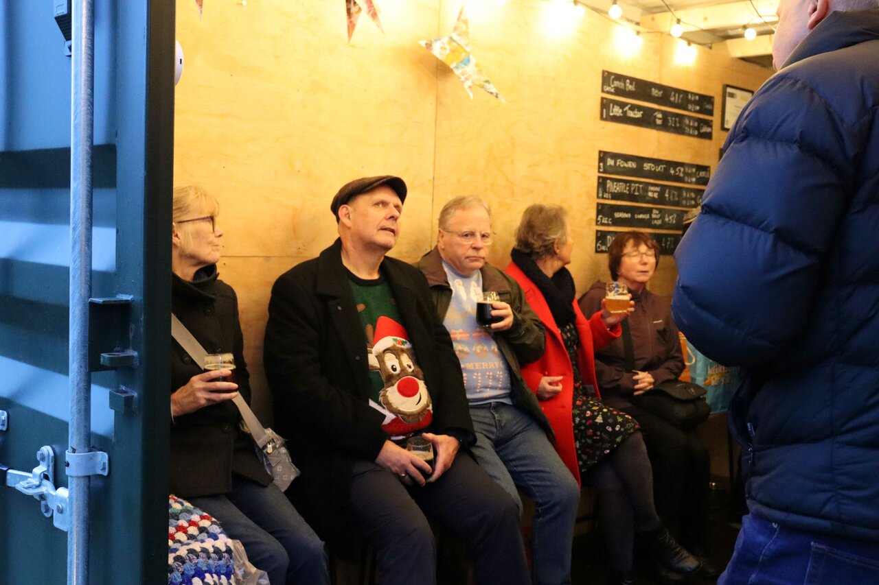 After leaving the Royal Oak, several members took up the invitation from Andy and Nicky, the owners of Castle Brewery, to call in for a pint at the brewery tap, called the Flow and Tracks. This unusual bar, which is near the brewery but not in it, comprises a shipping container on the banks of the river that has been nicely fitted out as a nano-pub with bar, plus seating under a pergola and even a warming patio heater.